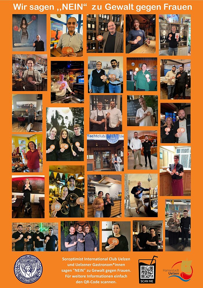 Plakate und Infoflyer begleiteten die Aktion in den vielen Restaurants, Bars und Cafés. Sie sind ein „Hingucker“ und können so von unzähligen Menschen in Uelzen auch gut wahrgenommen werden. Uelzens Bürgermeister Jürgen Markwardt begrüßt die SI-Aktion der Orange Days ebenso, „die Hansestadt Uelzen stehe in jeder Hinsicht hinter dieser großangelegten Kampagne“.