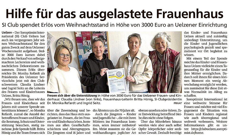 SI Club spendet Erlös vom Weihnachtsstand in Höhe von 3000 Euro an Uelzener Einrichtung.