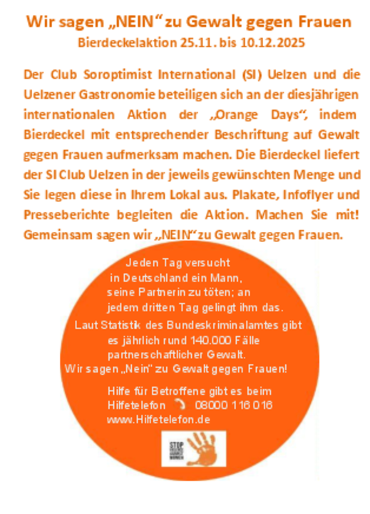 Der Club Soroptimist International (SI) Uelzen und die Uelzener Gastronomie beteiligen sich an der diesjährigen internationalen Aktion der „OrangeDays“, indem Bierdeckel mit entsprechender Beschriftung auf Gewalt gegen Frauen aufmerksam machen. Die Bierdeckel liefert der SI Club Uelzen in der jeweils gewünschten Menge und Sie legen diese in Ihrem Lokal aus. Plakate, Infoflyer und Presseberichte begleiten die Aktion. Machen Sie mit! Gemeinsam sagen wir „NEIN“ zu Gewalt gegen Frauen.