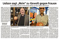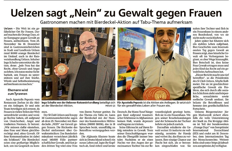 Apostolis Peponis vom Zorbas Restaurant in Uelzen ist die Orange – Days – Aktion des SI Clubs Uelzen ebenso ein besonderes Anliegen. Er und sein Team beteiligen sich erneut, „da ihnen klar sei, dass Frauen in vielen Teilen der Welt keine oder wenige Rechte hätten. Es gebe Orte, Menschen, Strukturen, welche eine Weiterentwicklung von Frauen nicht zuließen, sie unterdrücke – oft aus Unsicherheit, Angst, Minderwertigkeitsgefühl und aufgrund von tradierten Werten und Normen“, ist er sich sicher. „Wir müssen weiter dafür einstehen, dass Frau und Mann gleichberechtigt und gleich wichtig sind, ohne jede Form von Gewalt. Offene Kommunikation nehme hierbei eine Schlüsselfunktion ein“, sagt er. „Um ins Gespräch zu kommen, sind vor allem auch die nun erneut eingesetzten Bierdeckel des SI Clubs Uelzen eine großartige Möglichkeit“, so Peponis.