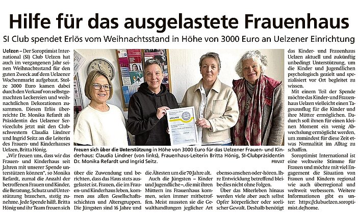 "3200 € - das ist ja eine gewaltige Summe!" Mit großer Freude nahm Britta Hönig als Leiterin des Frauen- und Kinderhaus Uelzen den Spendenscheck in Empfang, den ihr Dorothee Ebeling, Präsidentin des Uelzener Serviceclubs Soroptimist International, im Namen der Mitglieder des Clubs überbrachte. Das Frauen-und Kinderhaus Uelzen hatte zum wiederholten Male den Zuschlag der Clubmitglieder als Spendenziel für den Erlös des Weihnachtsmarktstandes am 3. Adventssamstag 2016 auf dem Wochenmarkt bekommen. In diesem Jahr allerdings fiel die Zuwendung besonders hoch aus, weil sie kräftig aufgestockt wurde durch den bundesweiten Hilfsfonds von Soroptimist International Deutschland. Die Verwendung dieser Spende steht auch schon fest: damit werden dringend benötigte Möbel für die Wohnungen im Frauenhaus angeschafft.